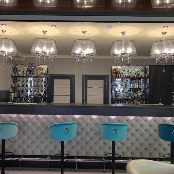 Диагональный узор украсил стену бара, позади полок с бутылками. Ничто так красиво не отражается в зеркале, как стекло, наполненное изысканными напитками. Зеркальная стена возле кресел умножает их насыщенный цвет и отражает блики, добавляя уюта помещению.